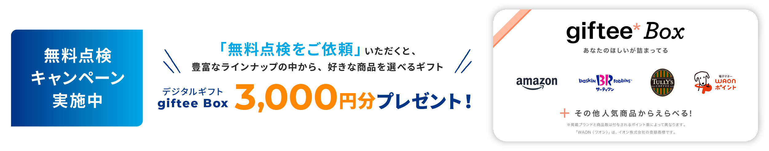 デジタルギフトgiftee Box 3,000円分進呈プレゼント(以下、本キャンペーン)対象者は、無料点検のご予約後、予約日前日(定休日を除く)までに担当営業とご連絡が取れ、予約日時に点検対象の建物の点検(無料)を実施させていただいた方が対象となります。