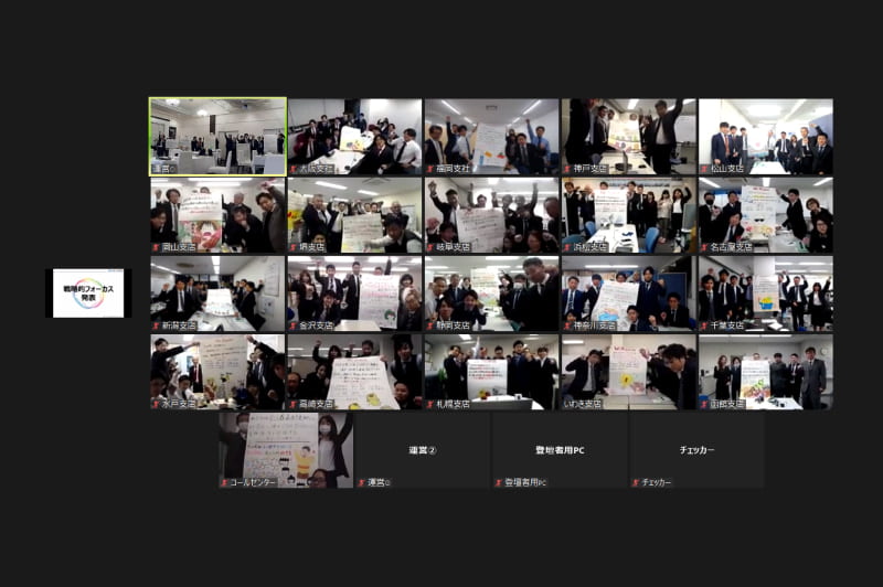 トップからのメッセージ、各部門の業績報告、月間優秀者の表彰だけでなく、社員にスポットがあたるスター賞(社内タイトル)表彰や事業目的を加速するお客様からの感動アンケートシェアなどを行います。 -