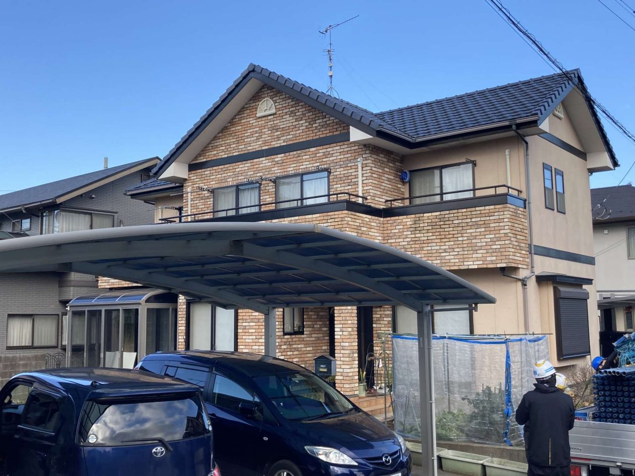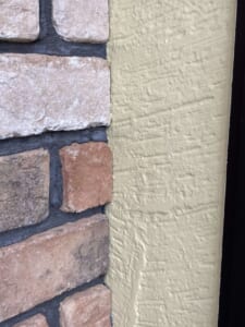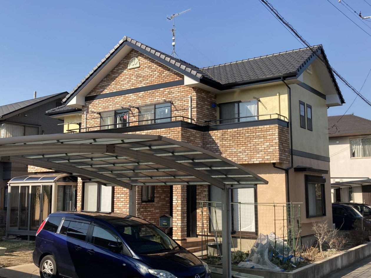 正面側のレンガタイルがこのお住まいの個性でしたので、レンガタイルに塗料を付けないように、境目部分の塗装はハケを使って作業を進めました。目立つ部分ではありませんが、こういった部分の品質にもこだわって塗装をしております。