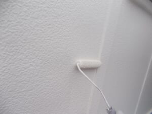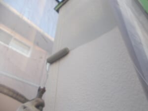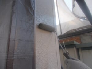 下塗りは外壁塗装をする上で外壁と塗料が直接密着する重要な工程となります。そして外壁下塗りの工程で均一に塗装ができなければ中塗り、上塗りの際も均一に塗布できなくなり表面に凹凸ができて仕上がりも悪くなります。塗料だまりがないよう細心の注意をはらい作業を行いました。