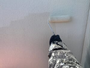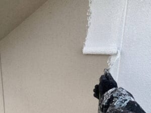 中塗り・上塗りには明るいクリーム色を採用。1階のレンガ調の総タイルの部分と、塗装した2階部分が双方引き立つようにイメージしながら作業をしました。また下塗り材が白色なので塗り残しがないよう注意しながら作業を進めました。