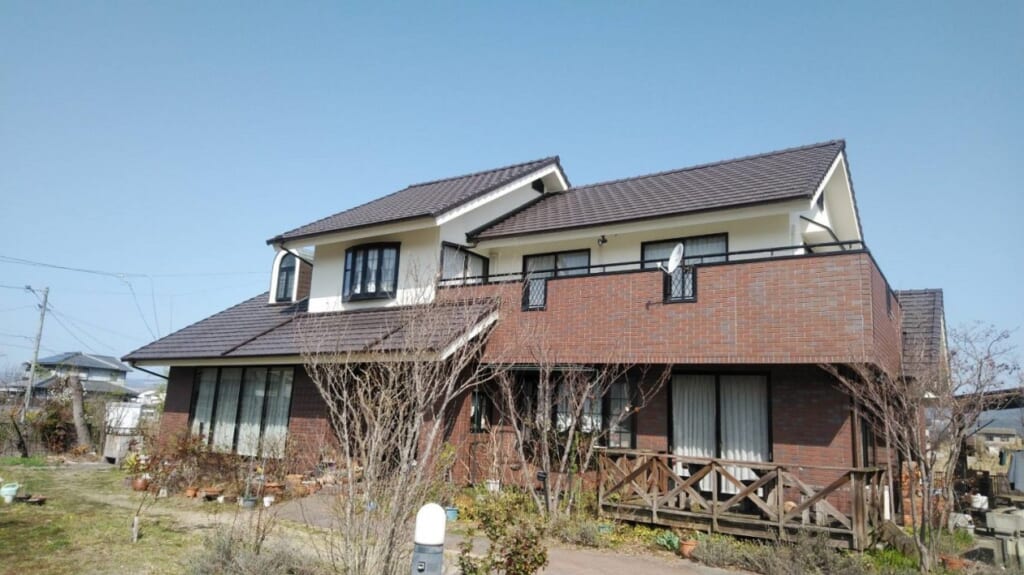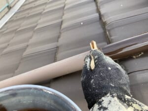 1階がレンガ調の総タイルの素敵なお住まいなので、付帯塗装は柔らかい印象の茶系にしました。茶色×クリーム色の配色は洋風のお住まいをより素敵にします。また雨樋も、塗りムラのないように丁寧に塗り込みました。