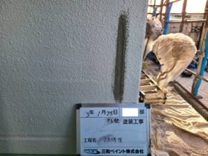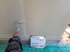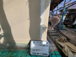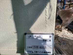 施工前に外壁の点検を行った際に数か所”塗膜ふくれ”が見られました。ふくれが起きる何らかの原因の一つは、外壁に水が回り塗膜の下にあった水分が蒸発することによって発生します。補修内容は、旧塗膜を削り、外壁の下地にカチオンシーラーを塗布し、ふくれを起きにくくしてから外壁塗装を行いました。