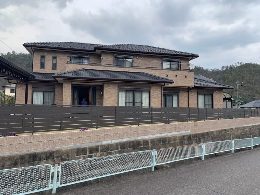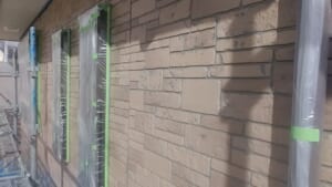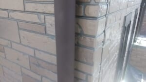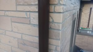 通常、付帯塗装は黒、白、茶の3色から選ぶことができます。このお住まいは外壁のブラウン系の石柄に合うよう、少し濃いブラウンを調色し、雨樋等を塗装しました。付帯も特注色で塗装して綺麗に仕上げることでよりお住まい全体のバランスが良くなり綺麗な仕上がりになりました。