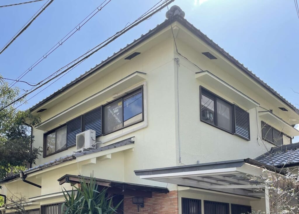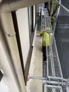 前回の外壁塗装工事ではラインのはみだしがひどい箇所がありました。そのため、出来る限り旧塗膜の除去清掃を行った後に新たなラインをテープを貼ってライン出しを行いました。真っすぐな新しいラインができとても綺麗に見えるようになりました。