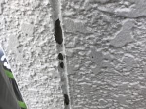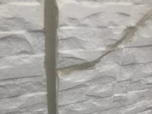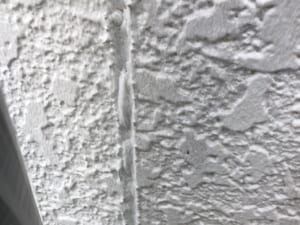 外壁は一部ひび割れが発生していたので、施主様確認の上、下塗り塗装作業に入る前に補修を行うことにしました。コーキング上の塗膜のひび割れ・膨れは、シーリング材が十分に充填できるよう、旧塗膜を除去してからコーキング作業に入りました。