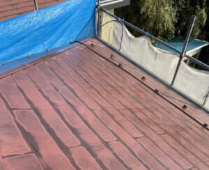 屋根の補修をしてから下塗り・中塗りを塗り上塗りを塗る事で 以前より、艶はもちろんのこと耐久性においても高められるので 見た目と耐久性の両方を担保できています。今回は屋根塗料にシリコン系の塗料を使い、5年の保証をつけております。
