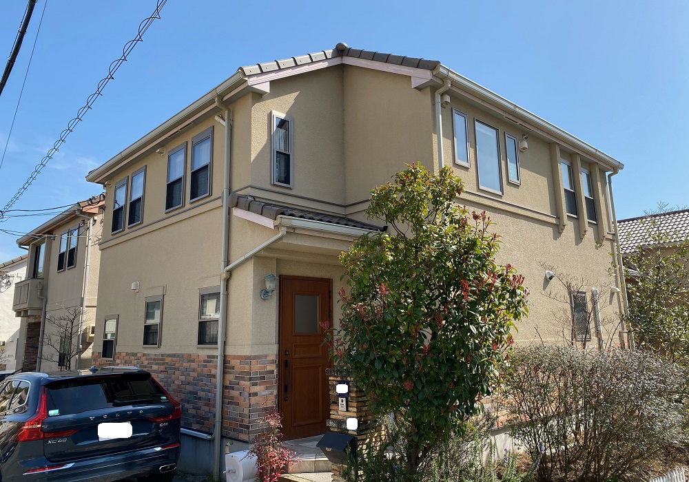 付帯塗装は、普段は既存の色に近い塗料で仕上げることも多いですが、今回は施主様からのお色を変えたいとのご希望がありましたので、雨樋や破風板の下地処理から塗料の調色まで、お住まい全体の色合いのバランスを取りながら塗装させて頂きました。レンガや窓サッシなどの塗装出来ない箇所をよりアクセントとして活かせるように付帯部分の色のアドバイスもさせて頂きましたので、美観面も自信を持ってお披露目出来ます。