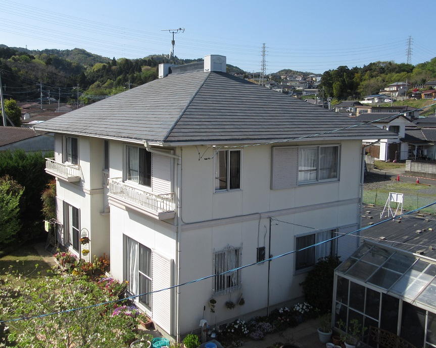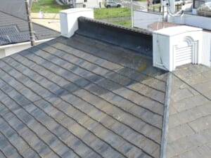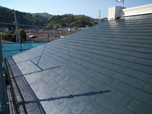 屋根の色を落ち着いたグリーン色で仕上げました。4月の屋根塗装工事でしたので屋根に朝露が残る事は少ないですが、乾燥時間に余裕もち、施工後のツヤ感に影響がでないように注意して屋根の中塗り・上塗り工事を行いました。