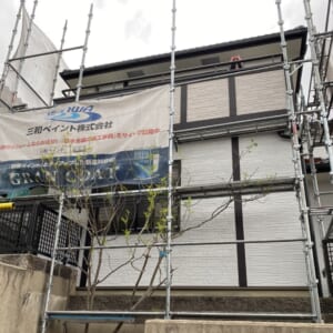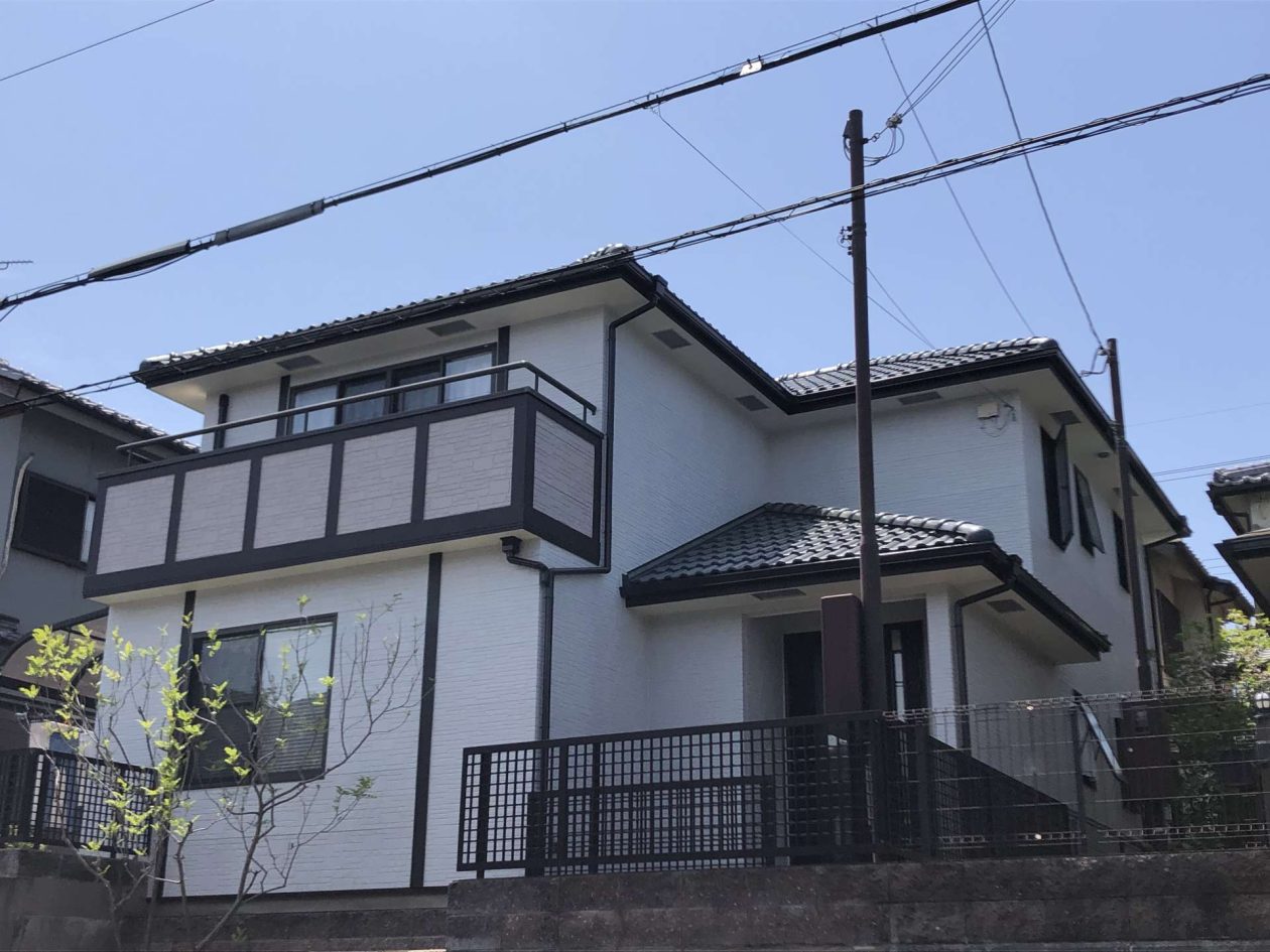 外壁はゾラコートという石目調の仕上げと白の2色で施工を行いました。色の取り合いと石目を均一に吹き付けていくのに苦労しました。吹付けをしている間は濡れ色で少し濃い色になるためわかりにくいですが、乾燥していくうちに黒や多彩な色が浮き上がってきます。その時にムラが生じるため見極めに苦労しました。