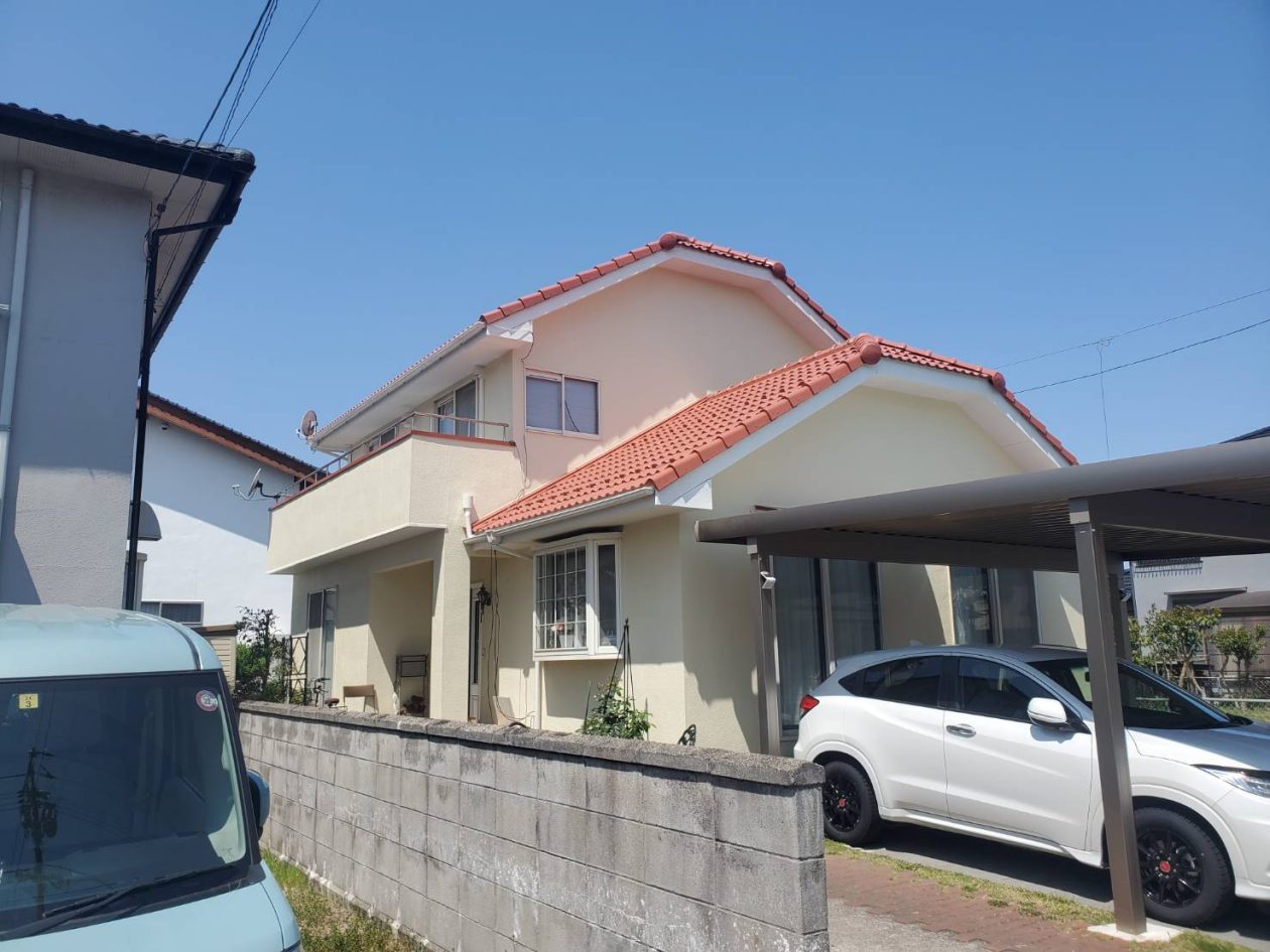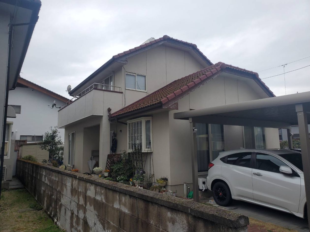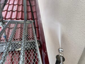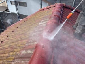 モニエル瓦のため、スラリー層が残らないようにしっかりと水圧をかけて洗浄し、付着していた苔も落とし切りました。外壁はモルタルのため、水圧に注意しできるだけ外壁を痛め無いように丁寧に汚れを落としました。丁寧な洗浄が塗装の仕上がりにも影響します。