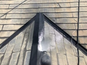 屋根塗装の前には屋根の汚れや苔などを取るために高圧洗浄が必要になります。細かい所まで丁寧に汚れを取りました。また、仕上がりをきれいにするためには欠かせないライン出しもテープを使用してきれいなラインを出しました。