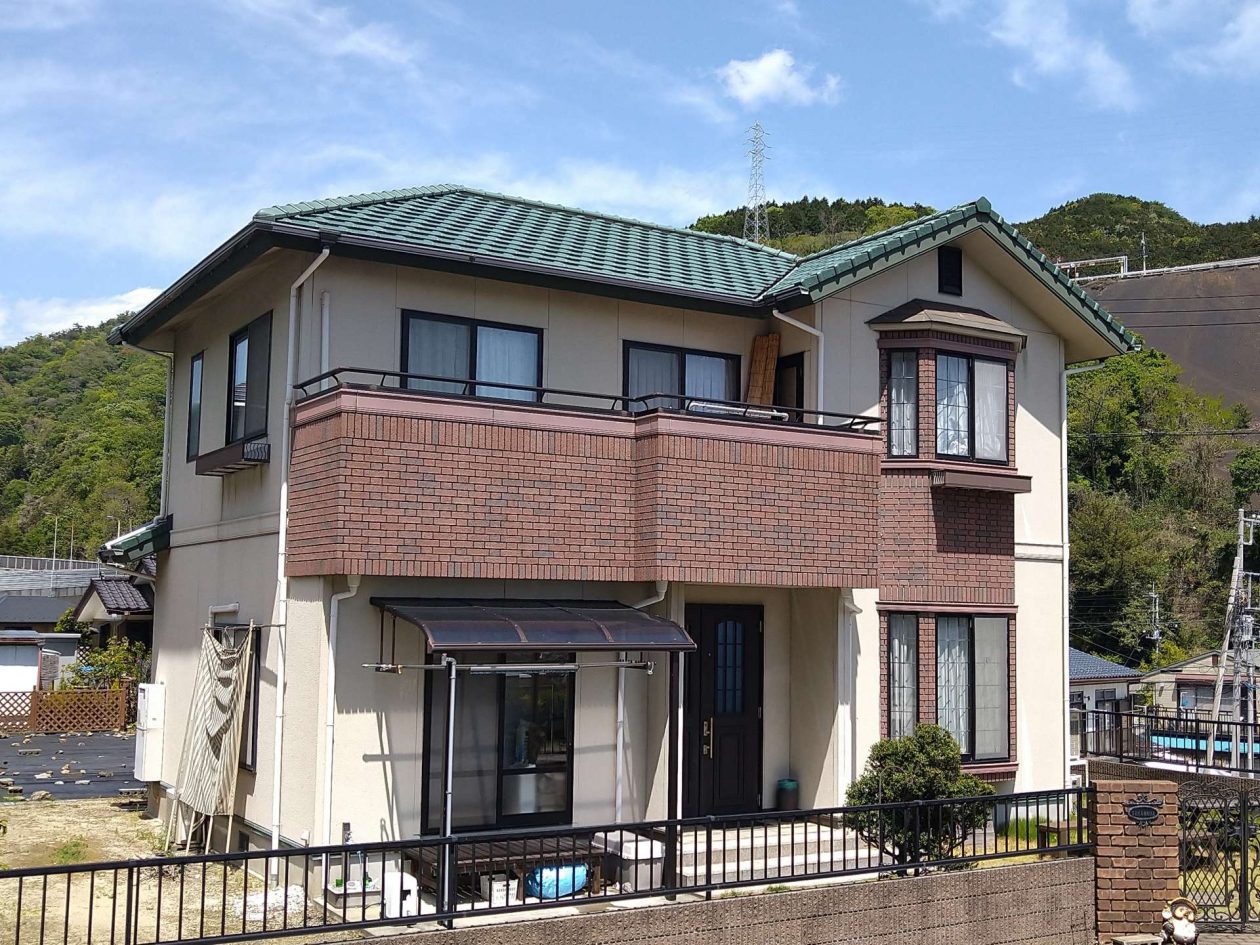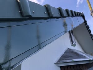 破風部分の塗装は普段は黒や茶系の色が多いですが、緑色で塗装いたしました。色選びに迷いましたが屋根の塗装を行わないので色が明るいと、屋根が浮いて見えてしまうので全体のバランスを考えました。施主様にも入念に確認をして頂き、仕上がりはとても良く、ほかのお住まいにはない仕上リになりました。