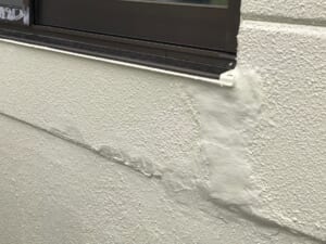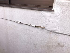 東日本大震災の地震の影響で窓枠にひび割れが出来ており、簡易的に補修されていました。外壁が剝れてしまっているところは、一度が外壁を剥がして下地から再度補修をかけ、水分が建物の中に入らないようひび割れを埋めていきました。