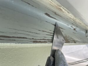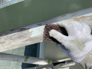 破風板には木材を使用されているお住まいでした。長い年月での経年劣化が著しく出ており、破風板の表面にめくれ等の傷みがありました。ケレン作業が不十分なまま塗装を進めていくと後に傷む原因となりますので、サンドペーパー等道具を何種類か使用して丁寧にケレン作業を実施しました。