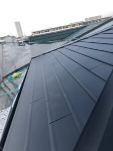パミールという屋根材で、塗装が出来ない屋根でした。パミールの屋根の場合は、カバー工法を行います。既存の棟板金を外して、防水シートを貼りしっかりと固定し次の工程に移ります。防水シートをしっかりと固定する事で、雨漏れや結露による劣化を防ぐ事ができます。