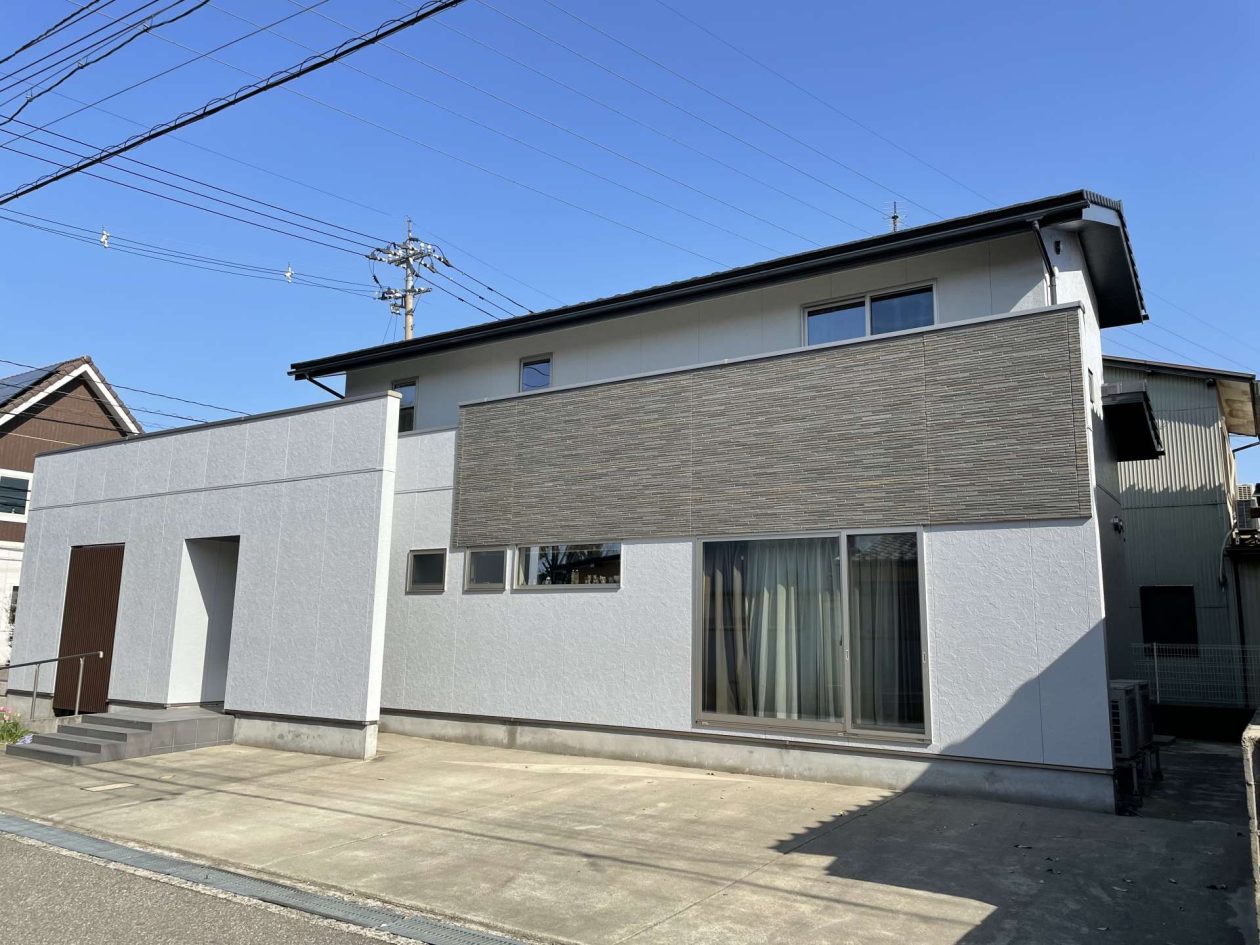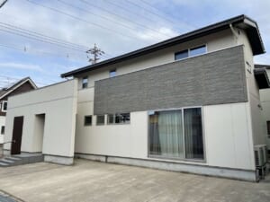 お住まいのリビング上部にあるベランダのみ、デザインボード(サイディングボード)になっており、デザインボード部分はフッソクリアー塗装で仕上げ、メインのパネルボードに合う塗装色で全体を仕上げていきました。最終的に塗装色の選択が良かったと思います。
