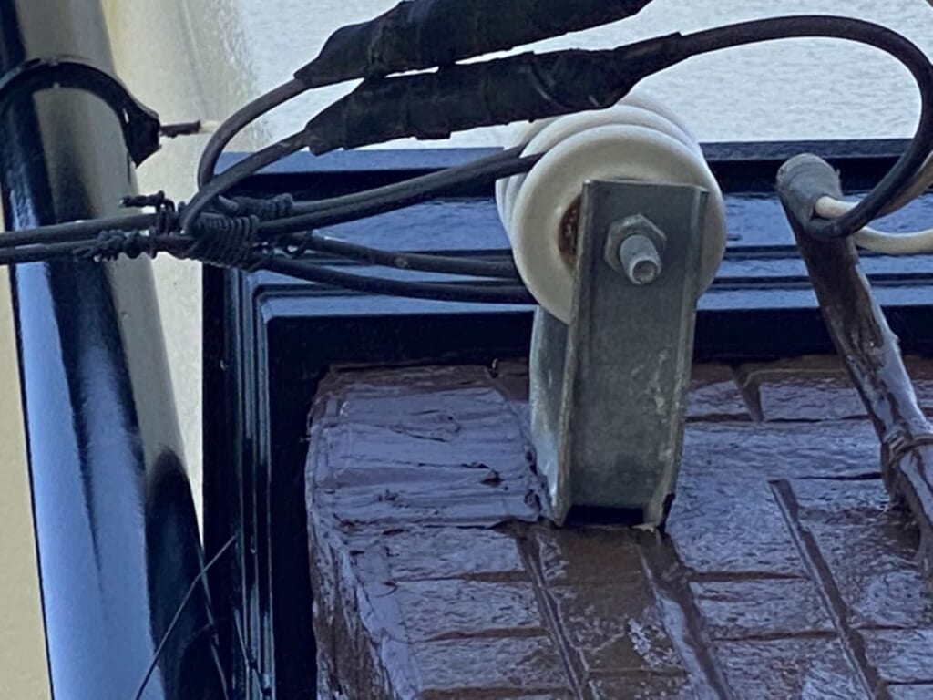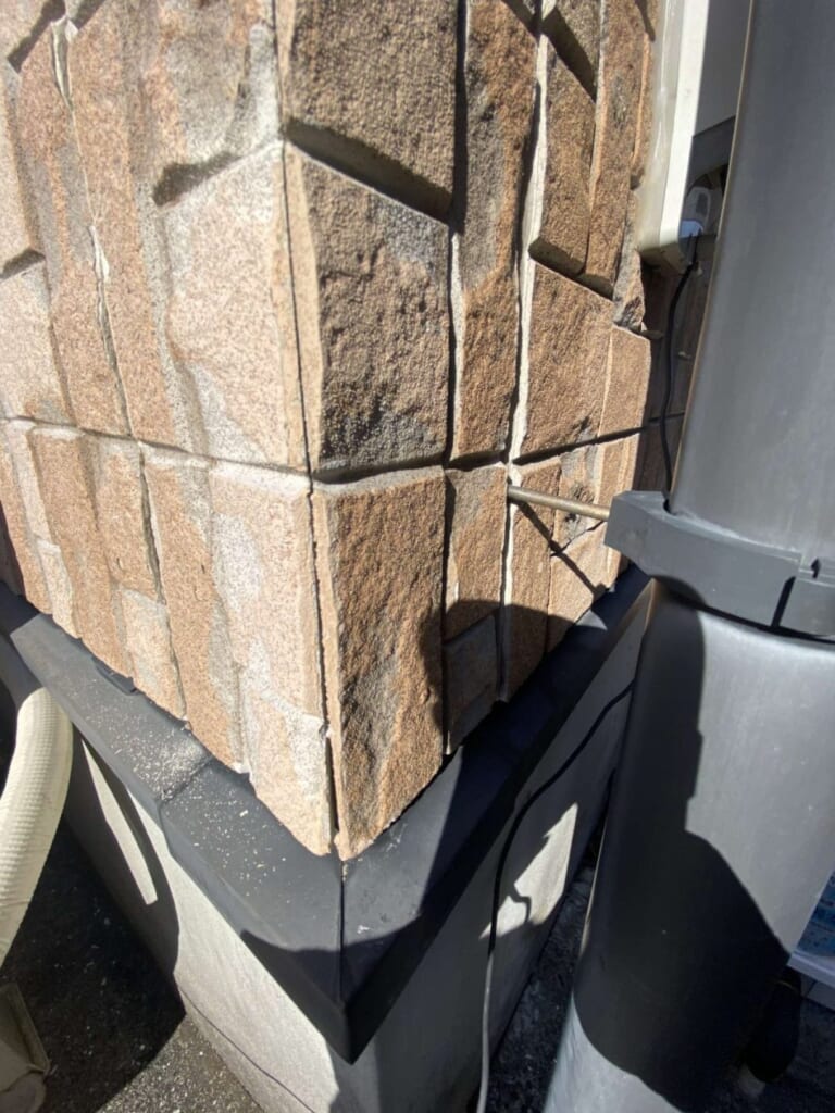 配線によって負荷がかかってしまったことで外壁が剝れてしまっていました。このままにしてしまうと雨水が入り込んで内装まで傷んでしまいます。まずは剥がれてしまった外壁部分に下地を塗って補修をし、ひび割れを埋めていきました。