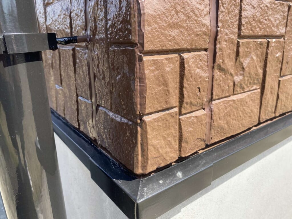 外壁のコーナ部分に隙間ができておりました。補修部分にシーリング材を擦り付け、補修箇所が目立ちにくくなる様、補修箇所を平らにしました。外壁塗装を開始した時に凹凸が出ない様に注意しながら補修していきました。