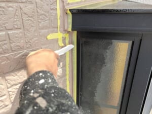 窓廻りには防水テープが貼ってあるので、今回は防水テープを傷めてしまい雨漏れの原因になる事を防ぐ為に、コーキングを全部剥がすのではなく、劣化部分だけを剥がして増し打ちしました。養生テープを使い、シール材がはみ出して窓枠や外壁に付くのを防ぎながら慎重に増し打ち作業を行いました。