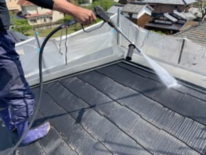ご近隣のお住まいとの距離が近かったので、屋根高圧洗浄をする際は水や汚れがご近隣のお住まいに飛び散らない様に気を付けました。飛散防止ネットと水圧を調整をすることで、近隣のお住まいにご迷惑おかけすることなく進めることができました。カビやコケを綺麗に洗浄し、屋根の塗料が綺麗に塗れる状態にしました。