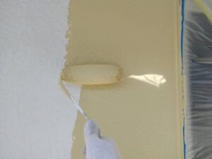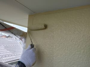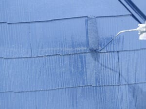 中塗り・上塗り作業では細かい所までしっかりと塗り込みました。屋根色は鮮やかなナスコンでしたので、天気予報に留意ししっかり乾いた状態で塗装するよう留意しました。外壁は、窓廻りや樋裏など塗料が入りにくい箇所は、刷毛を使い丁寧に塗りこみました。