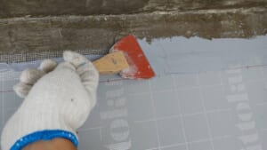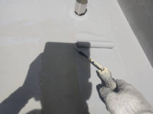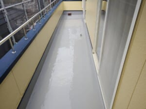 ベランダ下の軒天井に水が廻っている跡があったため、原因となっていたベランダ面の防水をご提案しました。今回、ウレタン通気緩衝工法で施工しました。傷みがでた場合の改修というのは非常に手間と時間がかかります。下地から丁寧に補修し、丁寧に仕上げました。