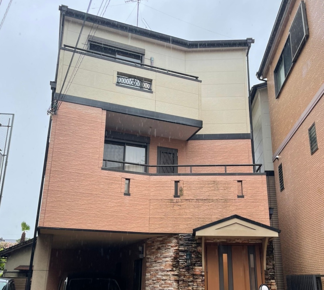 外壁が凹凸のあるサイデイングボードだったので、塗り残しや塗膜の厚みに差があると、色ムラの原因となってしまいます。そうならない様に、塗布する際に深い溝にはハケを使いました。他にも、十字に切って上塗りをしていきました。十字に切る塗装とは、縦横同じ方向に、同じ回数塗布していく方法になります。十字に切りながら塗布する事で、ムラなく綺麗に塗装できます。