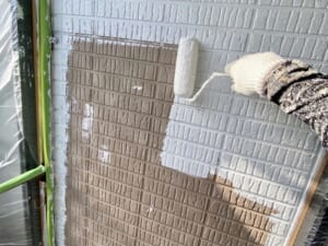 下塗りは、傷んだ旧塗膜に塗料を塗布することで防水性を持たせたり、傷をフラットにし基材を強化させたりと外壁塗装工事において非常に大切な工程です。経年劣化の激しい箇所がないか念入りに確認しながら、部分的なムラが出ないよう慎重に作業を進めていきました。