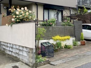 玄関まわりやお庭にたくさんのお花を飾られているお住まいでした。外壁塗装工事中に大切なお花を傷つけないよう、庭まわりの足場の本数は強度に支障の出ない範囲で極力減らし、細心の注意を払って足場設置を行いました。