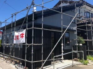 美容室を営業しながらの施工になりましたので、足場設置にも気を遣いました。なるべく道路にはみ出さない様に注意し、入り口を確保。お客様の通る箇所には足場に緩衝材を設置し、安全性を確保しました。また、営業中の看板も設置させて頂きました。