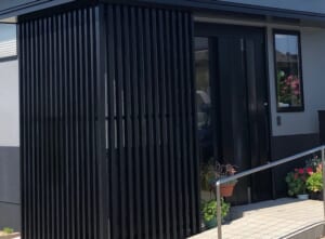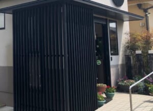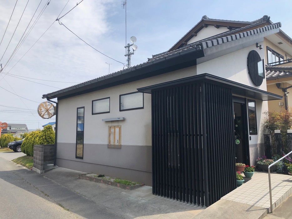 美容室でしたので、お店の印象を左右する美観回復も大切です。今回は入り口側の木格子と柱は、木部専用材でお店の看板の柱と電飾カバーも塗装させて頂きました。全て黒に統一され、グレーとのバランスが良くクールな印象に仕上がりました。