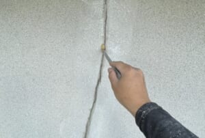 地震の影響で窓廻りのモルタル外壁にひび割れが多数できておりました。下塗り前に亀裂箇所をVカットした後、専用材でひび割れを塞いでいきます。補修箇所が多かったですが、細かなひび割れまで丁寧に施行しました。