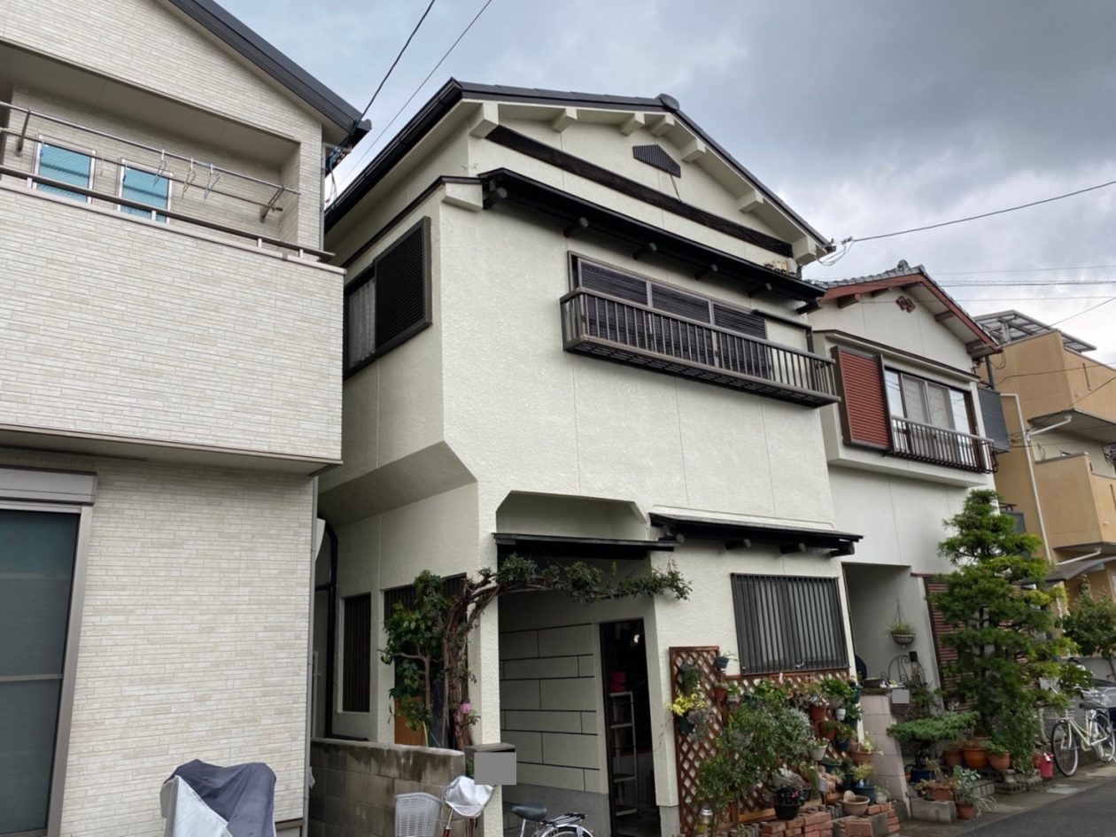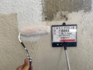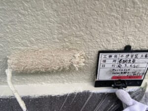 クラック(亀裂・ひび割れ)を補修した箇所が目立たない様に、均等に塗料を塗布し、仕上がりに拘りました。今回のお住まいは、外壁に小さな凹凸があるモルタル外壁でしたので、下塗りの段階からムラが出ない様に慎重に塗布していきました。