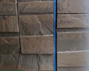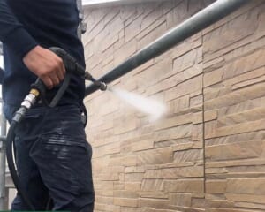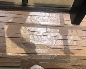 今回の施工内容は外壁が「クリアー塗装」ということでしたので、洗浄作業は細かく入念に洗いました。無色透明の塗料で塗装されるため、小さな汚れが残ってしまっては仕上がりに影響します。こちらの外壁の柄は凹凸もあり、動きのあるデザインであったため、洗浄のジェットも水圧を調整しながら、外壁を傷めないようにしながら洗浄するのは、かなりの集中力を使いました。