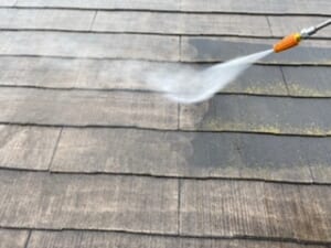 屋根にコケがかなりついており、少しでも残したまま塗装をしてしまうと将来的に剥離等につながる可能性があります。そのため入念に高圧洗浄しコケや細かい汚れ等を落としました。そうすることで塗料と建材の密着を強くすることができます。