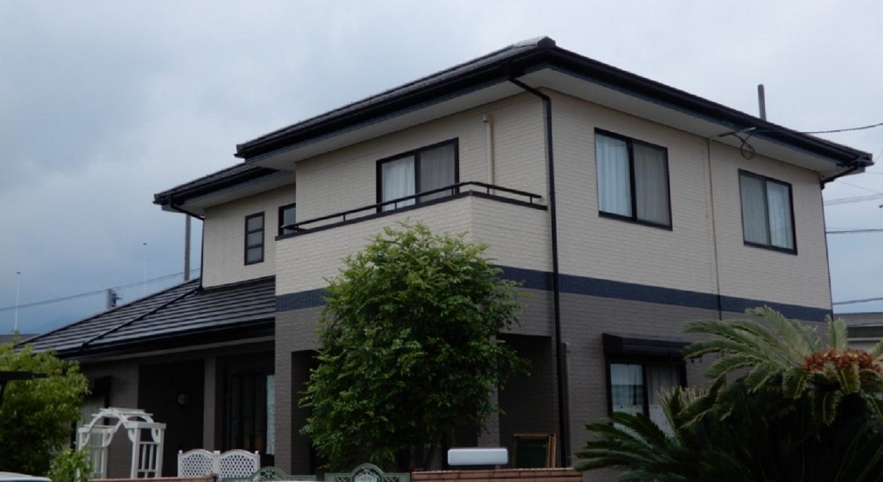 お建てになられて24年が経ち、建てられたハウスメーカーからも外壁塗り替えのお話がありご検討されていたそうですが、色の種類が少ない事と2色使いが出来ないとの事でお悩みになられていました。また金額的にも300万円近い提示があり高いと感じられていたそうです。三和ペイントでお色のご希望をお伺いし色分け方法のご提案をさせて頂き、お家だけではなく門扉やフェンス部分も艶消しの特色で塗装させて頂きました。