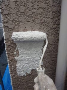 年数がたちかなり亀裂等の傷みが出ていたため、亀裂にしっかりと浸透し再生強化する特殊な下塗り材を使わせて頂きました。この下塗り作業が中塗り・上塗りに影響を及ぼし、塗料が長持ちするかのポイントとなりますので、丁寧に亀裂を埋めていきました。