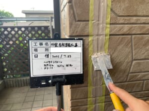 コーキングを注入する際に、コーキングがはみ出しても外壁に付かない様両サイドに養生テープをしっかりと貼り、丁寧に作業いたしました。注入後も、ヘラを使いコーキングを目地に押し込み段差や村が出来ないよう仕上げていきました。
