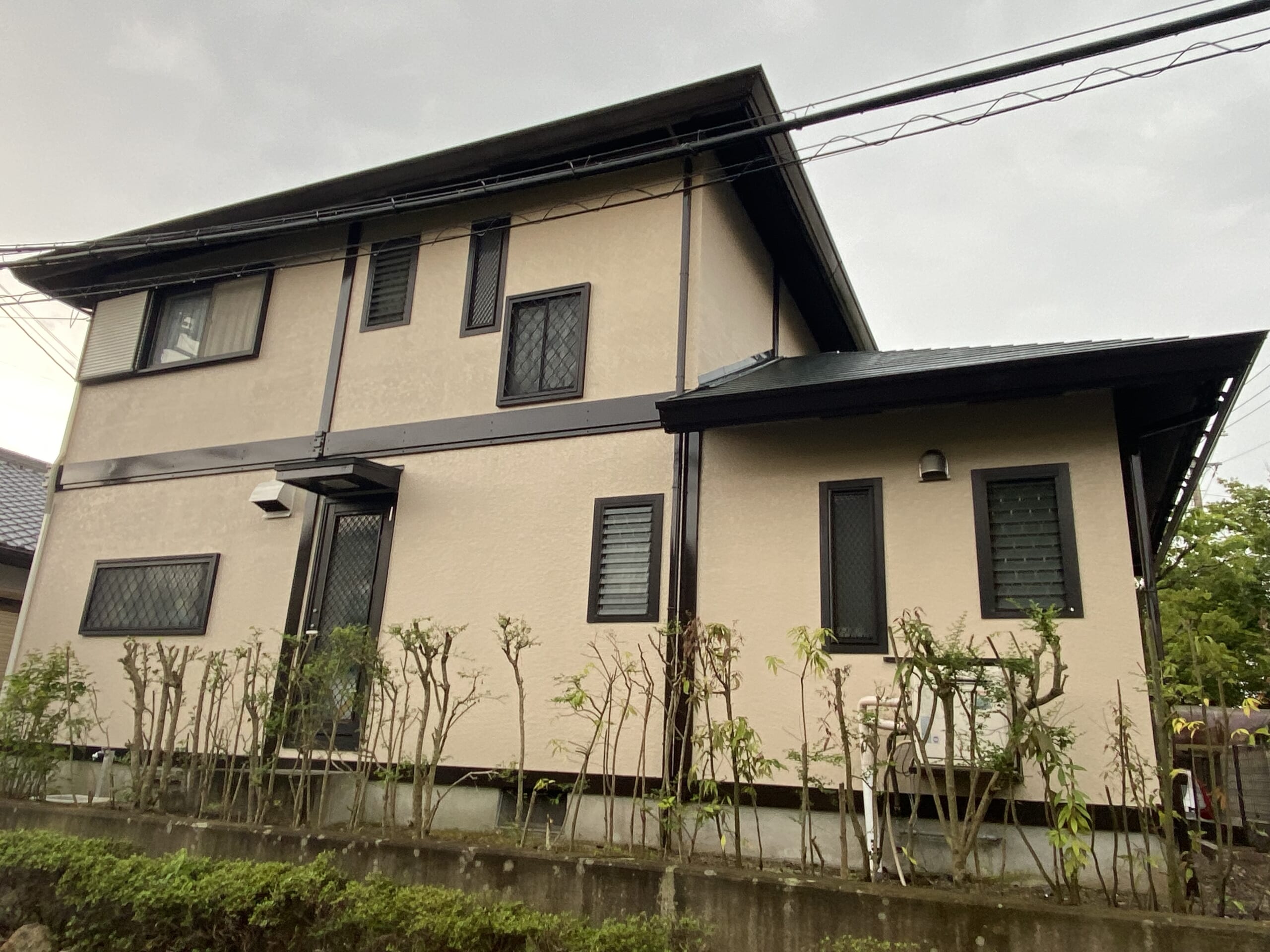 外壁がスタッコ仕上げで、凹凸部分に汚れやコケがひどかった為、丁寧に高圧洗浄を行い、水性クラフトという特殊な下塗り剤をローラーにてしっかりと浸透させました。また外壁にはクラック(ひび割れ)も入っていたため、塗装前に補修をしたひび割れ部分には特に注意しながら塗布しました。