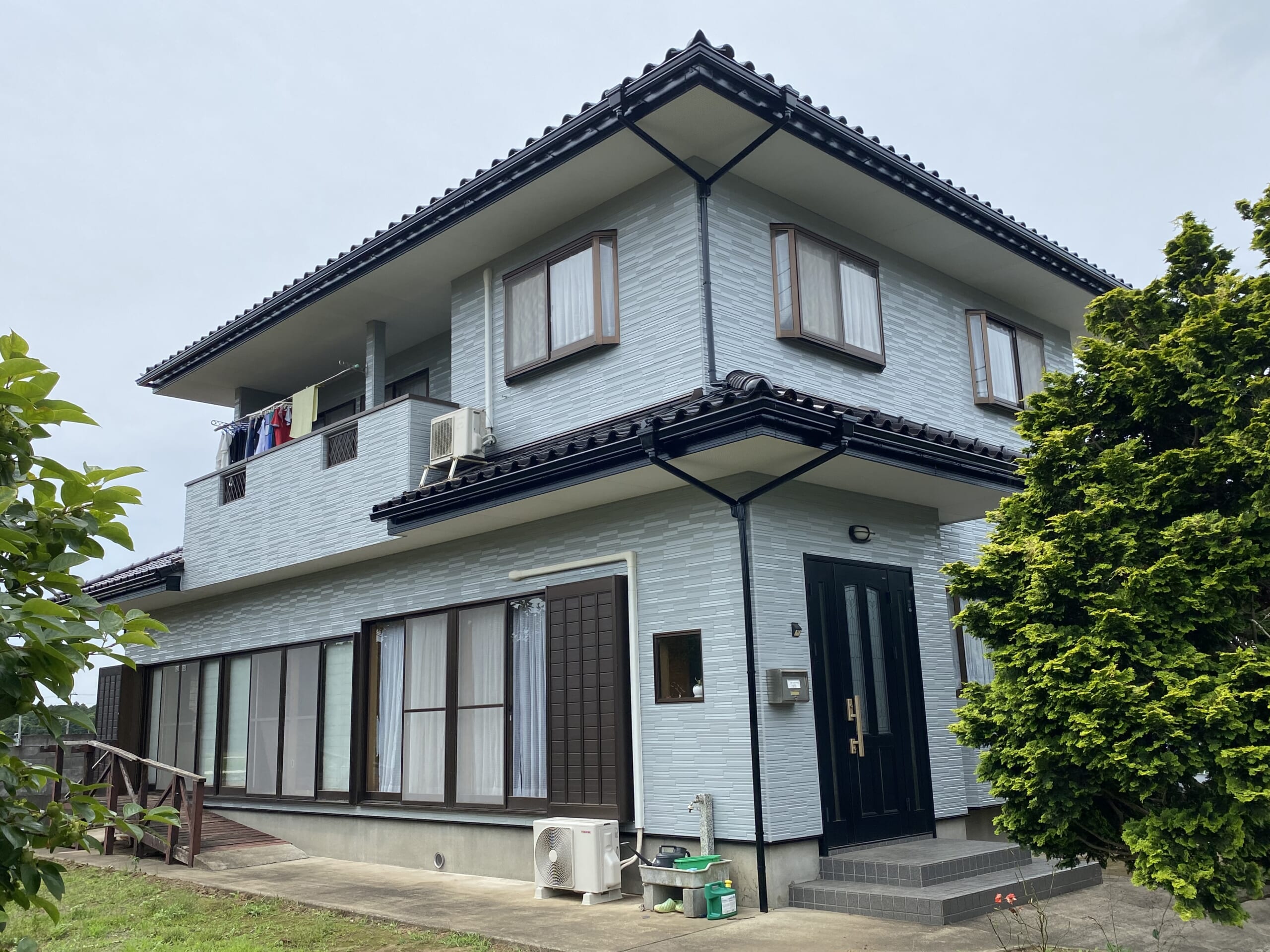 洗浄前は外壁も屋根も黒カビに汚染させれていました。