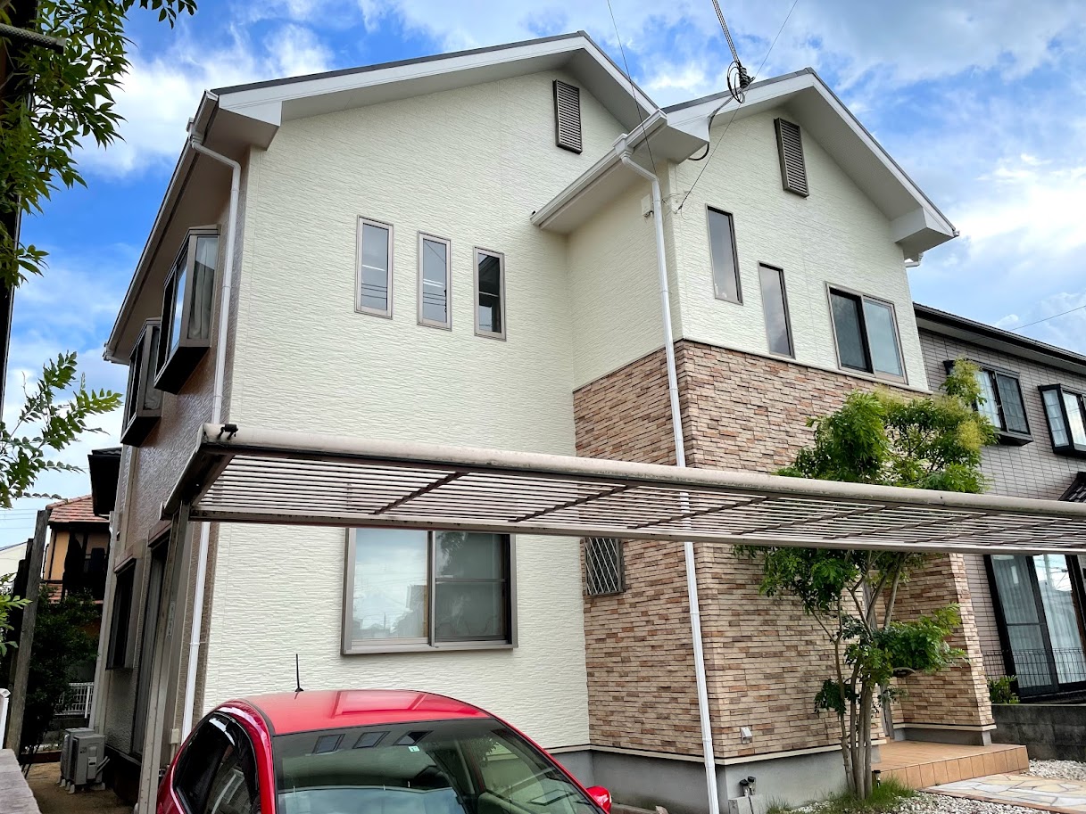 ぜひ見てほしいポイントはメインとなる外壁上塗りの仕上がりです。上塗りは外観の仕上がりとして印象に残る工程なので、ムラや刷毛跡などを残さないのは当然のことながら丁寧に仕上げさせてもらいました。クリーム色は特に清潔感が問われるので、境界部のライン出しもより丁寧さを意識し、付帯物の雨戸や雨樋とのマッチングも考慮して仕上げました。