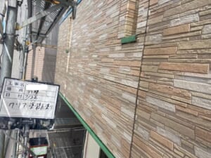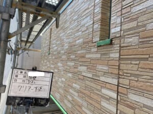 柄の入った意匠性サイディング外壁には、経年劣化による細かい欠損が生じていることもあります。そのままクリアー塗装をかけても欠損部が露見してしまうので、割れている箇所を塗装前にパテ埋めをして美観を回復させました。そのパテも、元の柄の色に合わせて目立ちにくいようにカモフラージュさせることはひとつの拘りです。