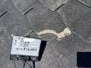 スレートの屋根瓦に無数のクラックが経年劣化により生じていました。割れた状態のまま塗装をかけてしまうと塗膜が膨れたり剥離が起きたりするので、コーキングによる接着・補修を入念に手掛けました。3回塗りで塗装を仕上げた後のコーキングの補修跡も見えにくくなるよう意識して施工しました。