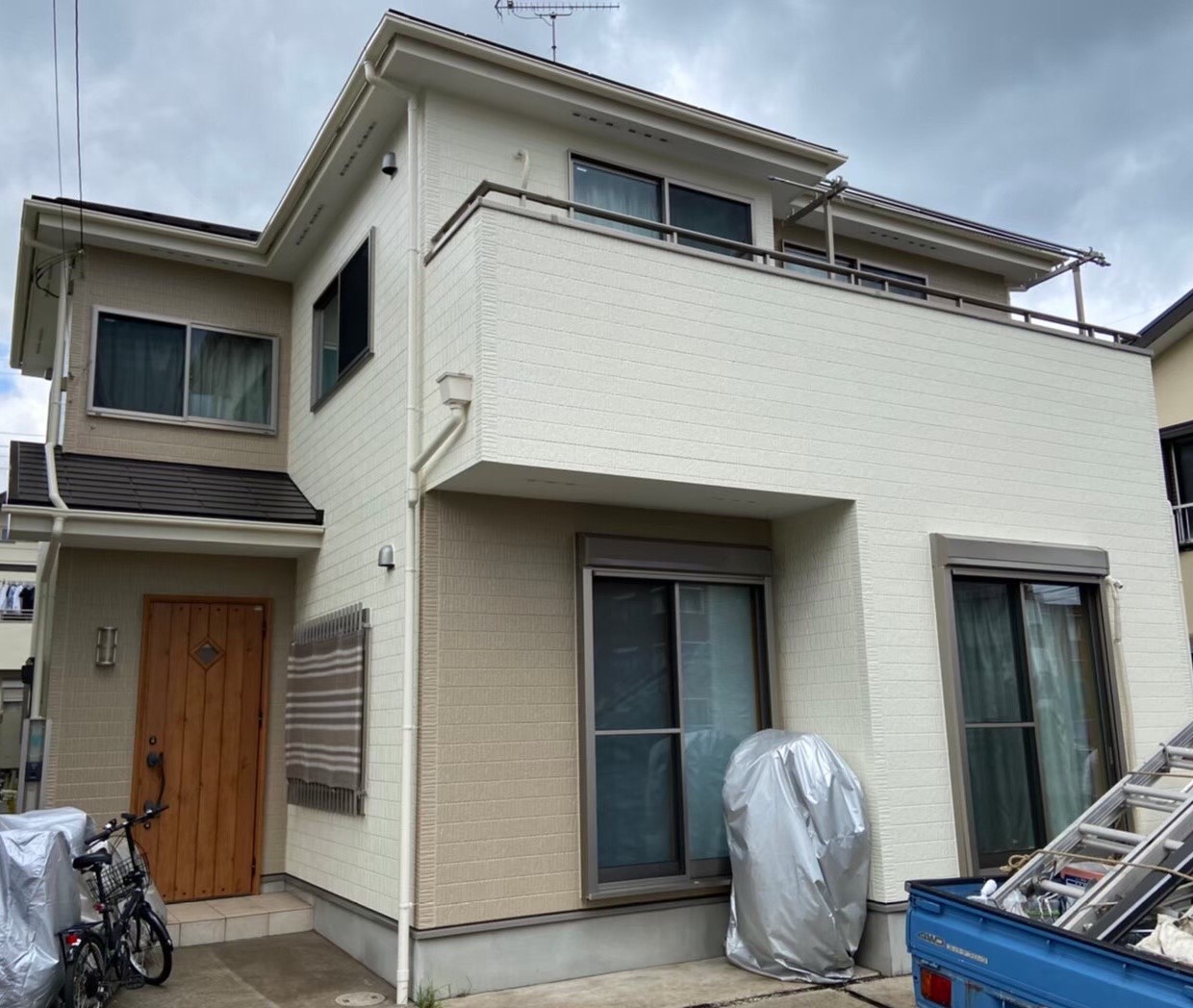 外壁の色味は慎重になられていました。色分けにはかなりこだわって分けたので単純な2色分けではなく、施主様のイメージに近づけるため何度も相談させていただき、色分けとムラがでないようにコーティングさせて頂きました。