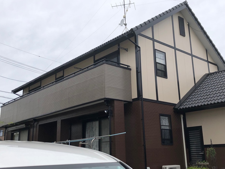 ベランダ部分に凍害によるボードの剥がれがありました。これは、サイディングボードが水を吸って脆くなったことが原因でおこります。ボードの劣化をパテとコーキングでしっかり埋めて補修をして、元の状態に近づけ下地作りをしました。その後下塗り~上塗りまで丁寧に塗装させて頂きました。
