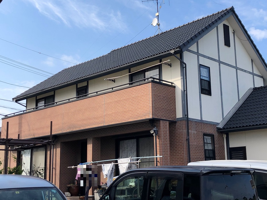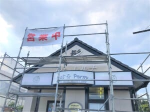 ご自宅との繋がりで美容室を経営されておりました。施工中も営業に支障が無いように足場の組み方に注意しました。お客様入り口を広く確保し、足場にはクッションシートを設置して安全に配慮致しました。また、営業中とわかるように看板も設置させて頂きました。
