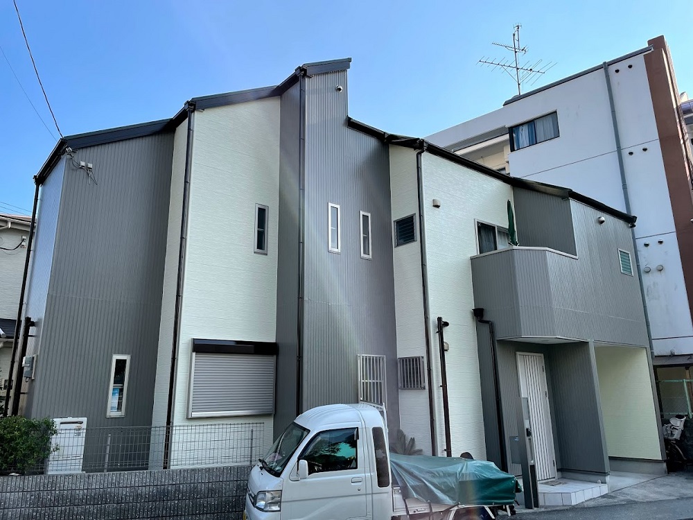 ぜひ見てほしいポイントは外壁の2トーンカラー仕上げです。お客様が拘って選ばれたお色を細かく打ち合わせて塗装させて頂きました。外壁のみならず、雨樋や破風板なども元の色からかなりイメージチェンジさせました!また2トーンカラー仕上げは2色の境い目に「ライン出し」と言って、綺麗な直線の境界を作ることも我々職人の腕が試されます。