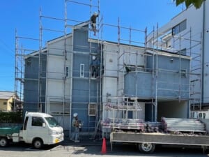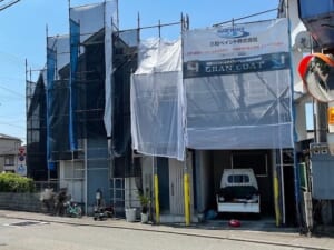 今回は車通りも多く狭い道路の角地に建つお住まいでしたので、足場設置にはかなり注意を払って作業させて頂きました。駐車トラック付近にはコーンを設置し、作業員の一人は交通誘導員として立たせました。プロの職人でも命がけの足場設置ですが、通行人の方々や車にご迷惑は絶対に掛けられないので徹底致しました。