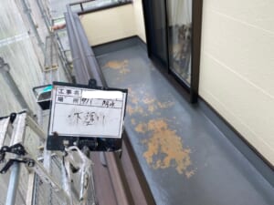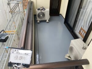 ベランダ床部分のFRP防水が経年劣化により剥離していたので、ケレン作業、下塗りにプライマー、トップコート2回という工程手順を踏みました。ベランダ床は特に、住居者様も毎日のように歩く場所になるので、塗装の劣化も早いですが、きちんとした工程を踏むことでしっかり保護できます。